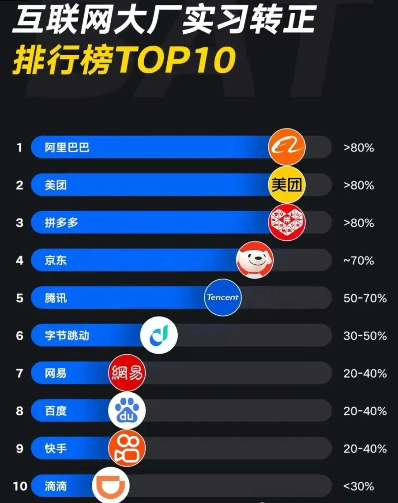 在网上看到一张《互联网大厂实习转正排行榜TOP10》的图,从这张图中我们也不能发现: